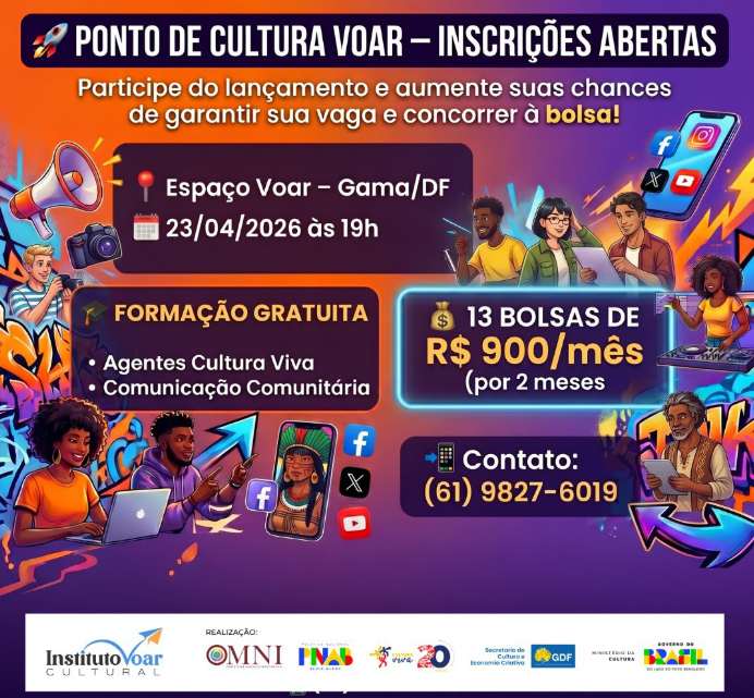 O Ponto de Cultura Voar está com inscrições abertas para jovens de 18 a 24 anos interessados em formação gratuita nas áreas de cultura e comunicação. O lançamento oficial será nesta quinta-feira, 23 de abril, às 19h, no Espaço Voar (Setor de Múltiplas Atividades do Gama, Conjunto K, Loja 5). A participação no encontro é recomendada para quem deseja entender o processo e ampliar as chances de seleção. Informações: (61) 99827-6019
