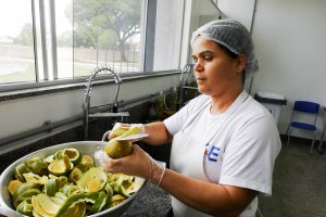A merendeira Elivania Nogueira, de 48 anos, conta que a rotina de trabalho na alimentação escolar é boa, principalmente porque tudo chega muito fresquinho. Ela diz que faz tudo com muito prazer e segue uma orientação recebida: cozinhar como se fosse para os próprios filhos, nunca servindo algo de má qualidade. Para ela, trabalhar com ingredientes frescos é muito gratificante e torna o preparo mais saboroso. Explica que a variedade de produtos facilita o trabalho e permite inovar no cardápio. Sobre o retorno dos alunos, afirma que eles sempre elogiam. “Tia, estava uma delícia o lanche”, escuta quase todos os dias.