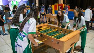 Com apresentações musicais e atividades interativas, o ambiente foi preparado para oferecer momentos de descontração e acolhimento. No local, os alunos podem jogar totó e pingue-pongue, interagir com as atrações no palco e deixar mensagens em um grande mural coletivo para fortalecer laços e o espírito esportivo que marcam os jogos.