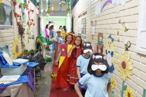 A iniciativa cativa os estudantes com sala de histórias, apresentações musicais e encenações