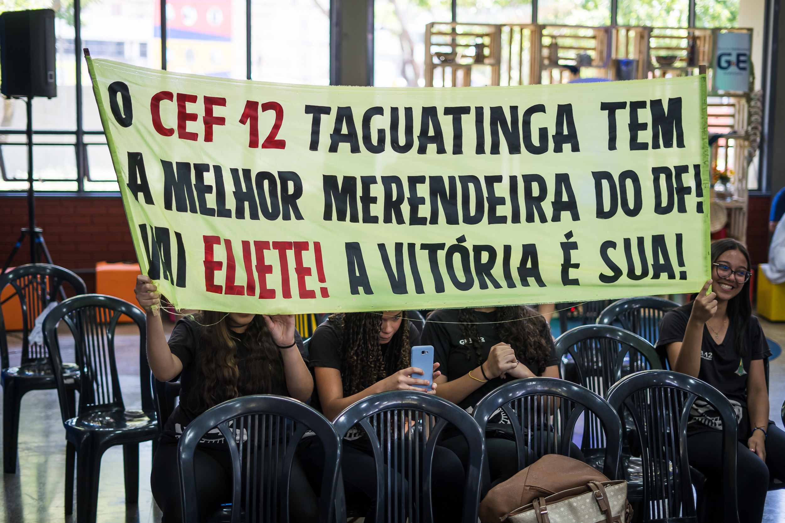 Na quinta (19), o primeiro dia da disputa, as alunas Millena Santos, de 15 anos, Giovanna Rodrigues, 13 anos, Anny Karoline Rodrigues, 14 anos e Yasmin Oliveira, 14, se animaram para prestigiar uma merendeira especial. Alunas do 8º e 9º ano do Centro de Ensino Fundamental (CEF) 12, de Taguatinga, elas compareceram ao evento com faixa para demonstrar o carinho que sentem pela profissional que prepara a alimentação na escola.