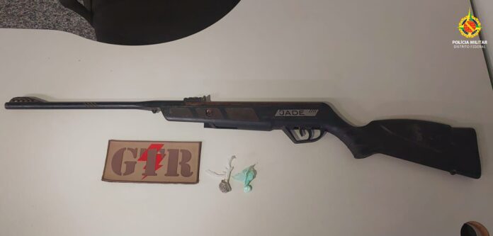 Durante a abordagem, foi possível visualizar um rifle calibre 22 dentro da residência. O suspeito acabou assumindo a propriedade da arma e disse que a adquiriu de um desconhecido por R$ 500,00.