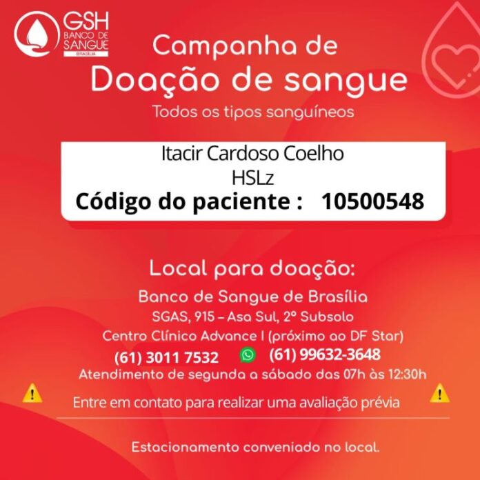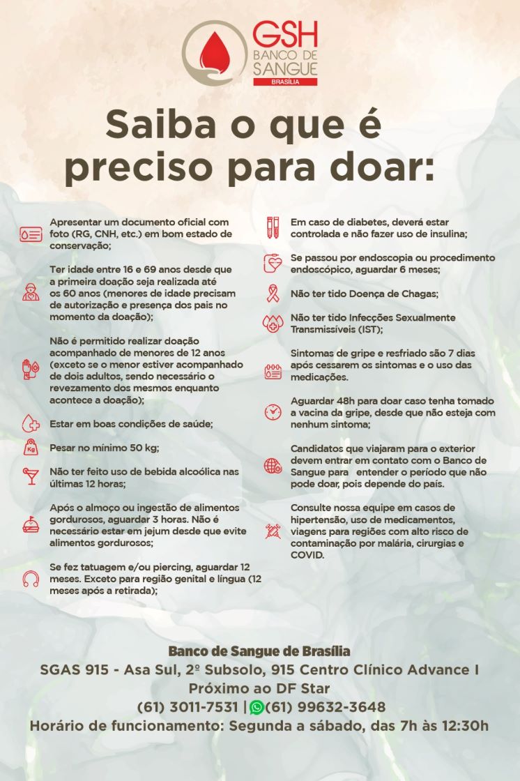 Local para doação: Banco de Sangue de Brasília (SGAS, 915, Asa Sul- 2° Subsolo)- Centro Clínico Advance I, próximo ao DF STAR