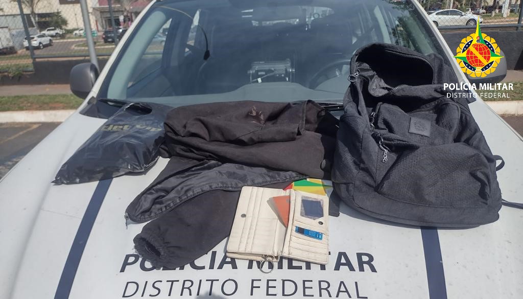 Ela disse que foi abordada no gramado da alça oeste e teve a bolsa roubada. Os suspeitos tinham comprado uma camisa e uma calça em duas lojas na Rodoviária. Ambos foram localizados na Plataforma E.