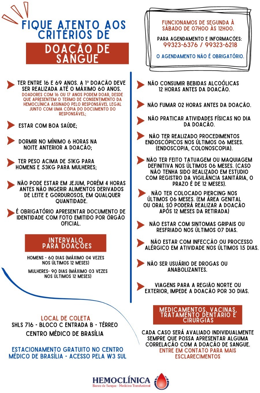 As doações devem ser realizadas de segunda a sábado, das 7h às 12h. Maiores informações pelo número (61) 98595-3332.