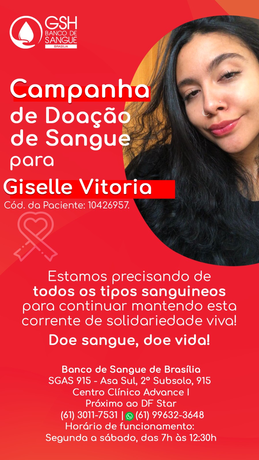 A paciente Giselle Vitoria, filha de sargento da reserva remunerada, H Silva, CFSD 58/22 ncessita de doadores de sangue de qualquer tipo sanguíneo. Os interessados devem comparecer no Banco de Sangue de Brasília e citar o nome da paciente, código número 10426957