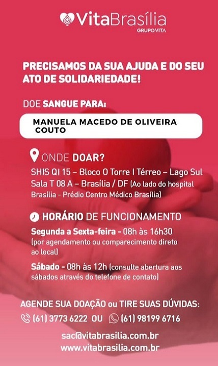 A paciente Manuela Macedo de Oliveira, parente do Tenente Coronel Pires, necessita de doadores de sangue de qualquer tipo sanguíneo. Os interessados devem comparecer na SHIS QI 15, bloco O, Torre I, sala T 08 A, Lago Sul.
