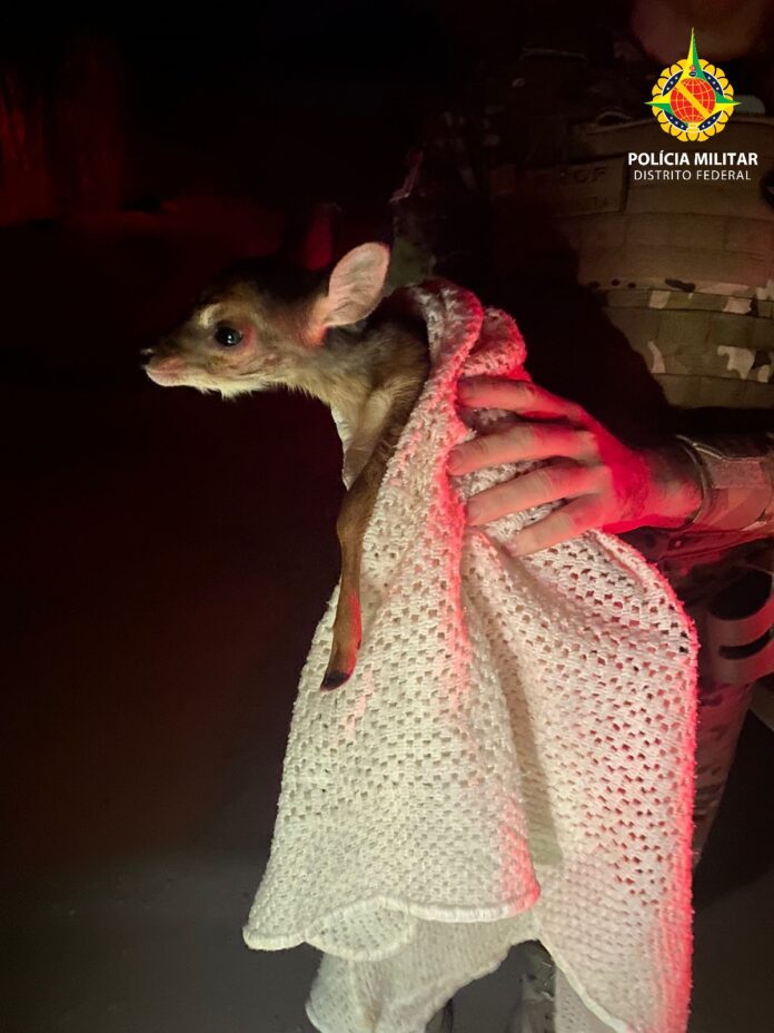 Policiais militares do Batalhão Ambiental (BPMA) receberam a solicitação para realizar um resgate de um filhote de veado catingueiro de aproximadamente 40 dias, às 18h deste sábado (12) na Fercal. O animal estava sendo cuidado por uma família que o achou perdido na rua.