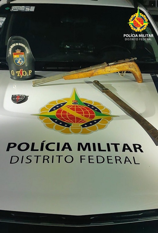 A equipe da PMDF foi até a casa do suspeito e ele confirmou a desavença com os vizinhos. Ele autorizou a entrada do Gtop 35 na residência e mostrou onde estava a arma caseira calibre 12 e o facão.