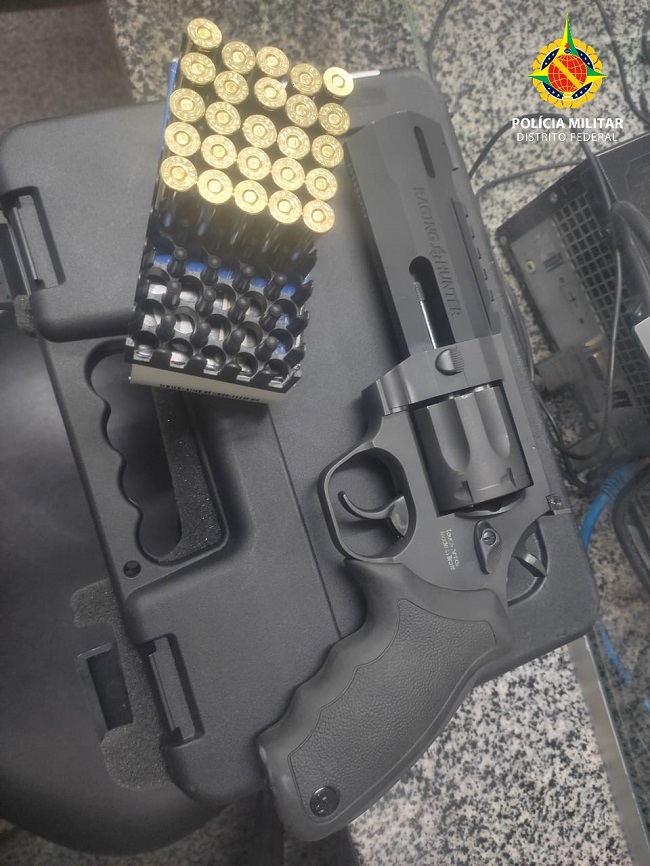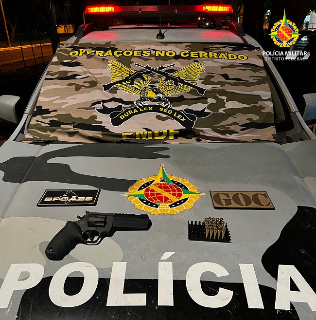 Policias Militares do Batalhão de Policiamento Ambiental (BPMA) e do Batalhão de Policiamento com Cães (BPCães) realizavam um ponto de bloqueio no Gama quando abordaram um homem que conduziu uma Toyota/Hilux. No interior do veículo foi encontrado um revólver calibre 357, uso restrito, e 25 munições. O homem foi conduzido à 20ª Delegacia onde foi autuado por porte ilegal de arma de fogo de uso restrito.