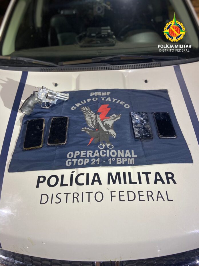 No local, os policiais militares visualizaram o suspeito e realizaram a abordagem policial. Com ele foram encontrados quatro aparelhos celulares e um simulacro usado para intimidar as vítimas.