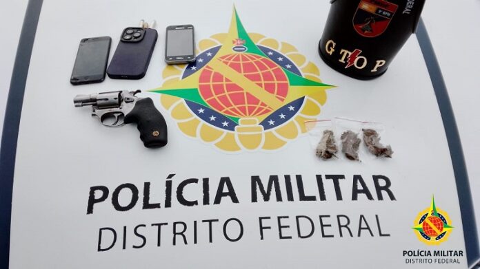 Os policiais do 9º Batalhão estavam realizando um ponto de bloqueio no setor Oeste quando abordaram um veículo com dois ocupantes. Na busca pessoal, nada de ilícito foi encontrado, mas durante a busca no veículo, foram encontradas porções de maconha e uma arma de fogo, um revólver calibre 38 com três cartuchos de munição intactos.