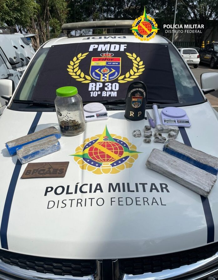 A equipe de RP 30 com o auxílio do BPcães (Batalhão de Polícia com Cães), apreenderam 4 tabletes de maconha, 11 porções da mesma substância, um pote contendo maconha, duas balanças de precisão e materiais utilizados para o preparo das porções.