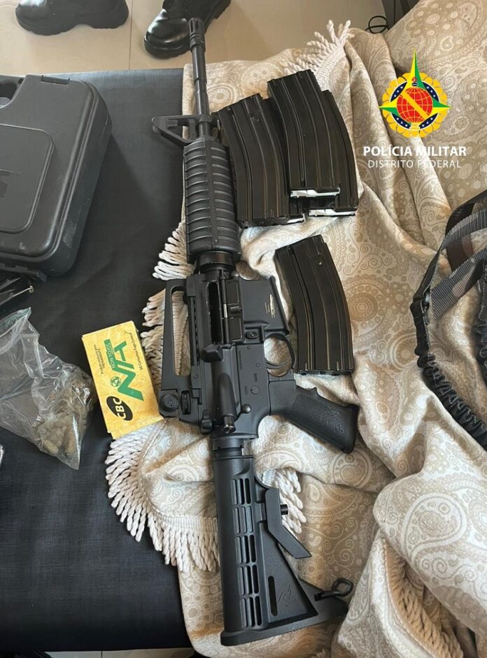 Os policiais militares do Batalhão de Choque durante estágio em que parcipava integrantes PMDF e PMGO, apreendem fuzil, pistolas, drogas e munições em Taguatinga, as 12h30 desta quarta-feira (27).