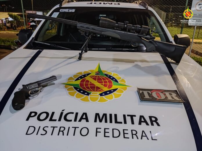 Os militares realizaram a busca veicular localizando um fuzil, calibre .308, marca Remington, sem munições, e um revólver, calibre .357, marca Taurus com 14 munições intactas.
