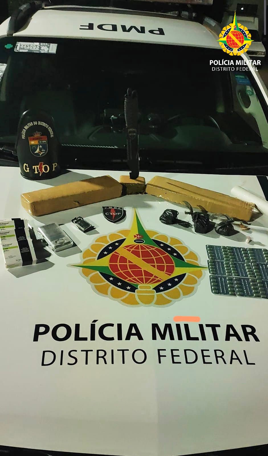 Ao realizarem a busca no perímetro da residência, o Gtop 35 visualizou dois tijolos de maconha sendo jogados pela janela. As duas pessoas que estavam na casa atenderam ao chamado dos policiais.