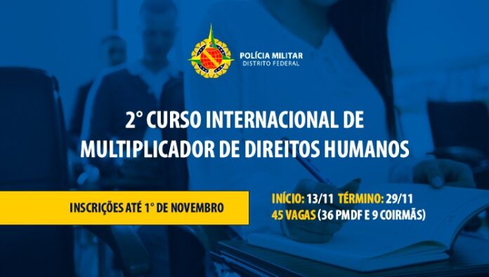 A Diretoria de Especialização e Aperfeiçoamento (DEA), da Polícia Militar do Distrito Federal (PMDF), informa que as inscrições para o 2° Curso Internacional de Multiplicador de Direitos Humanos (Nível Misto 2023) estão abertas. Foram disponibilizadas 45 vagas no total, sendo 36 para a PMDF e 9 para coirmãs. O início será no dia 13/11, com previsão de término para a data de 29/11.