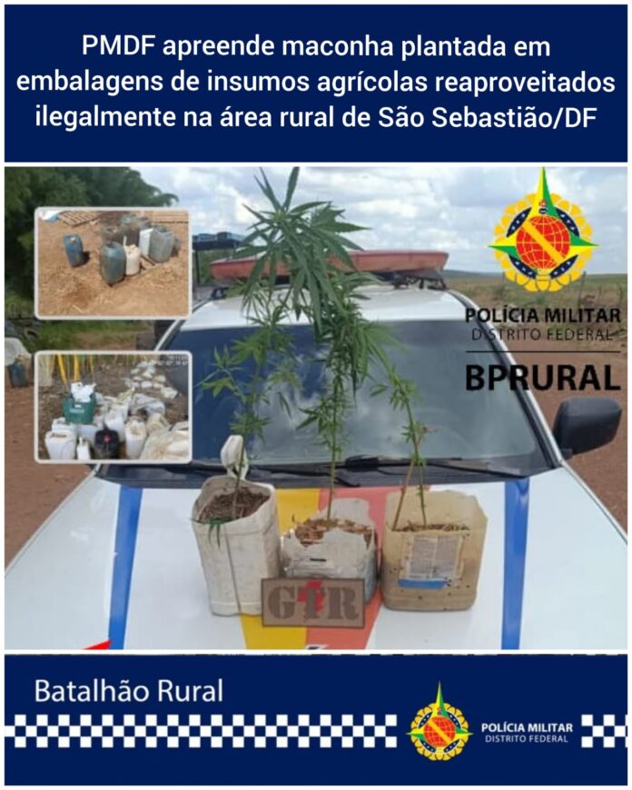 Os militares foram acionados para apoiar uma equipe de fiscalização de insumos agrícolas. No local, verificaram irregularidades no armazenamento e descarte de defensivos agrícolas e ainda foram encontradas três mudas de maconha.