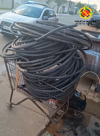 No local, foi encontrado dois homens com grande quantidade de fios em um carrinho de supermercado, além de uma bolsa de mão com algumas ferramentas.