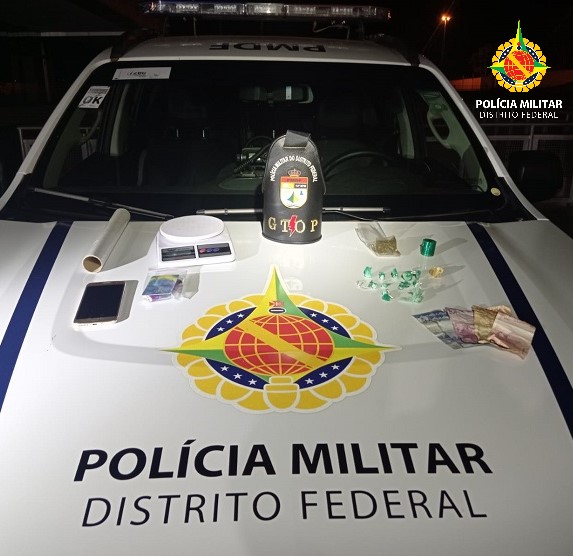 O foragido ainda estava na posse de maconha, crack e cocaína, equipamentos para o tráfico e um aparelho celular na Estância Mestre D’Armas-II; módulo “H”; Planaltina-DF.