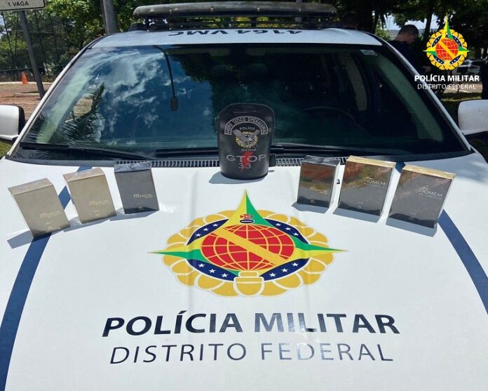 Foi apreendido com o homem embalagens contendo seis frascos de perfume no valor total de R$ 1.434.00 (um mil quatrocentos e trinta e quatro reais), que fora subtraído do comercio local na quadra 08 de Sobradinho I.