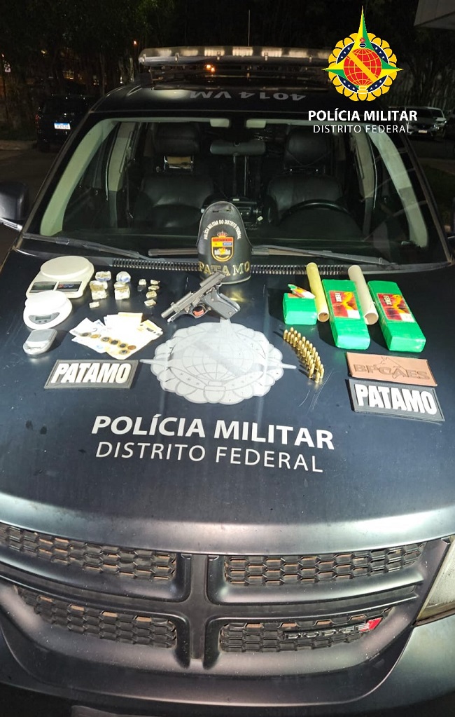Os policiais militares do Batalhão de Choque realizaram a apreendeção de arma e drogas no condomínio Privê em Ceilândia, efetuando a prisão de um traficante no domingo (26), por volta das 19h40.