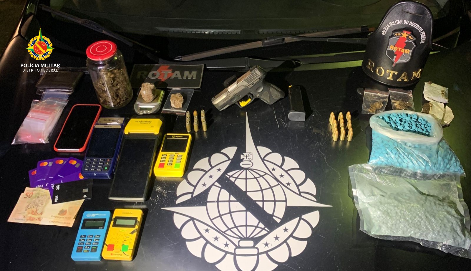 Na casa do abordado os policiais encontraram uma pistola 9mm com a numeração suprimida, 18 munições intactas, dois sacos com grande quantidade de ecstasy, porções de maconha, haxixe, Skank, crack, balança de precisão e uma máquina de cartão de crédito.
