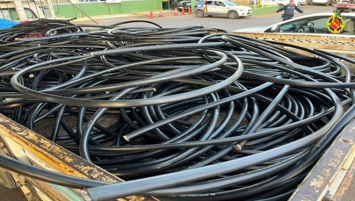 A equipe patrulhava a cidade quando foi acionada para uma possível ocorrência de roubo de fios de energia no Polo JK. Ao chegarem no local, os policiais se depararam com três indivíduos que, ao perceberem a aproximação da viatura, tentaram fugir. O trio foi abordado e com eles foram apreendidos uma grande quantidade de fios de cobre, rádio comunicador e um machado.