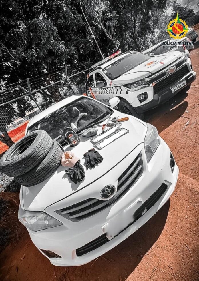 Os policiais do 5º Batalhão receberam informações de que um veículo Corolla de cor branca, que ostentava placa de outro veículo, teria sido utilizado para cometer furtos no interior de carros no estacionamento do Big Box, no Lago Norte.