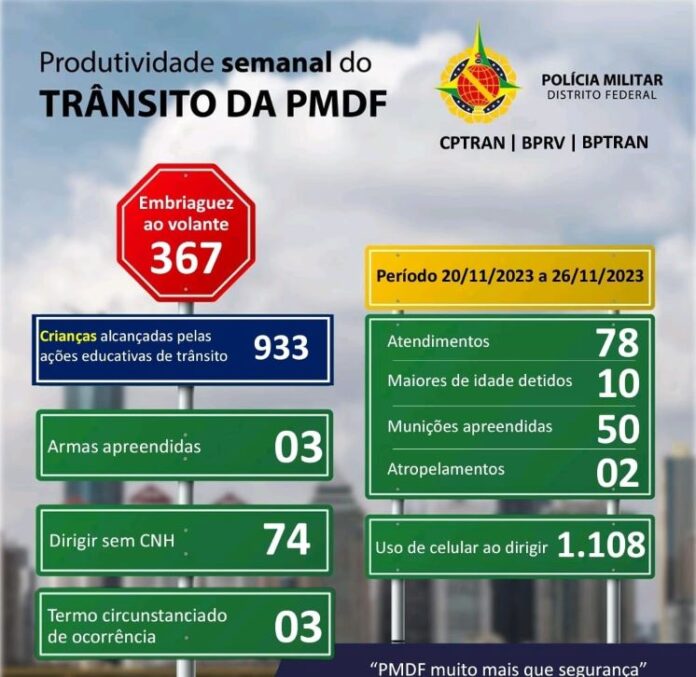 A Polícia Militar do Distrito Federal (PMDF), por meio do Comando de Policiamento de Trânsito (CPTRAN), envolvendo o Batalhão de Policiamento Rodoviário (BPR) e o Batalhão de Policiamento de Trânsito (BPTRAN), demonstrou, novamente, alta produtividade em suas operações, em toda a região.