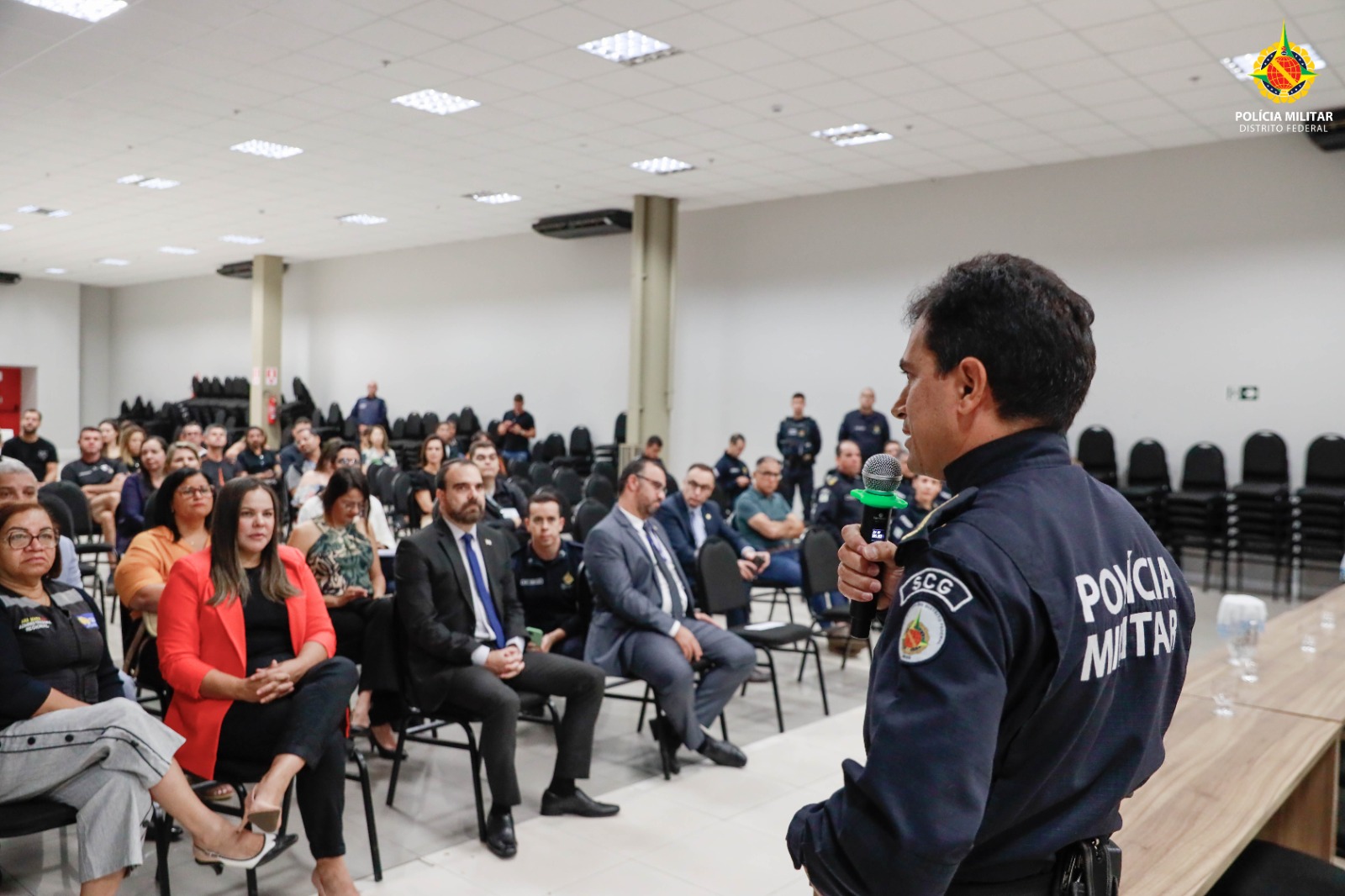 Com a palavra, o senhor Alexandre Rabelo Patury, Secretário Executivo da Secretaria de Segurança Pública do DF (SSP/DF), agradeceu ao Batalhão de Policiamento Escolar pelo compromisso que os policiais militares honram perante à sociedade, e pediu apoio das comunidades nesta incansável luta, mantendo os jovens fora das ruas, os educando sempre.