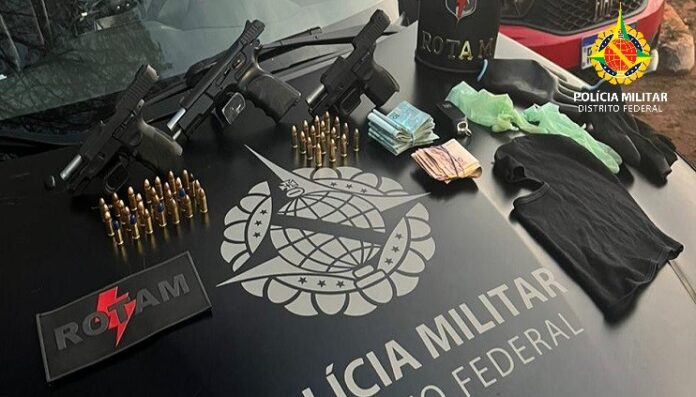 Quando em patrulhamento o veículo Argo foi avistado pouco antes do balão do aeroporto. O condutor foi abordado e no interior do veículo foram encontradas três pistolas calibre 9mm municiadas, cartuchos de munições, balaclava, luvas, dinheiro em espécie no montante de R$ 8.710,00 e um celular produto de furto. Restou constatado que o veículo se tratava de objeto de furto e que a placa do veículo estava adulterada.