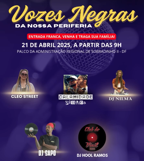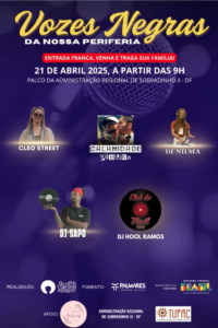 Na segunda-feira, 21 de abril, a partir das 9h, o projeto Azulim para Todos realiza o evento Vozes Negras da Nossa Periferia, no palco da Administração Regional de Sobradinho II. A programação reúne artistas e DJs em uma grande celebração cultural que exalta a potência das vozes negras, com entrada franca e atividades abertas a toda a comunidade.Tudo aberto e gratuito. Informações pelo Instagram @gc.azulim