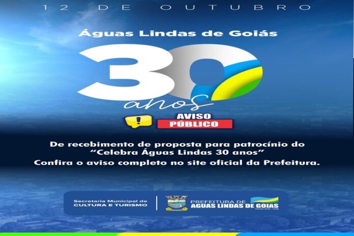 A Secretaria Municipal de Cultura e Turismo (SECTUR) de Águas Lindas de Goiás-GO torna público que recebeu proposta avulsa de patrocínio para a realização do evento “Celebra Águas Lindas 30 Anos”, a ocorrer nos dias 10, 11 e 12 de outubro de 2025.