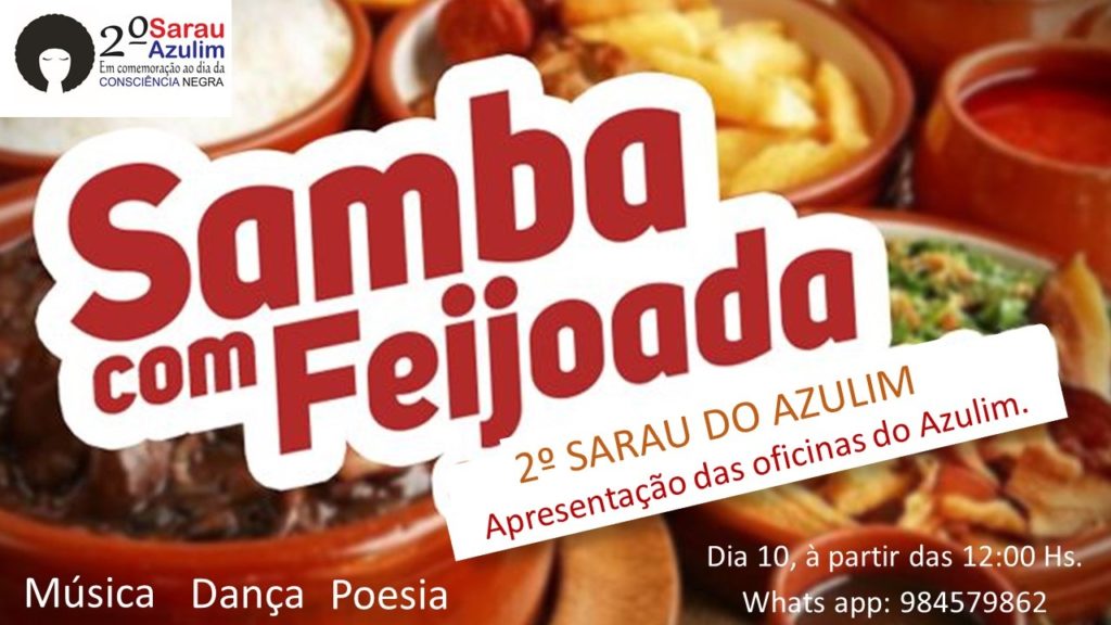 O Grupo Cultural Azulim irá promover neste domingo (10/11), das 12h às 21h, a 2ª edição do Sarau do Azulim, com feijoada regada a música dos grupos Samba de Rodas e Pagode de Raça. O evento faz parte das comemorações do Dia da Consciência Negra, celebrado no dia 20 do mês de novembro.