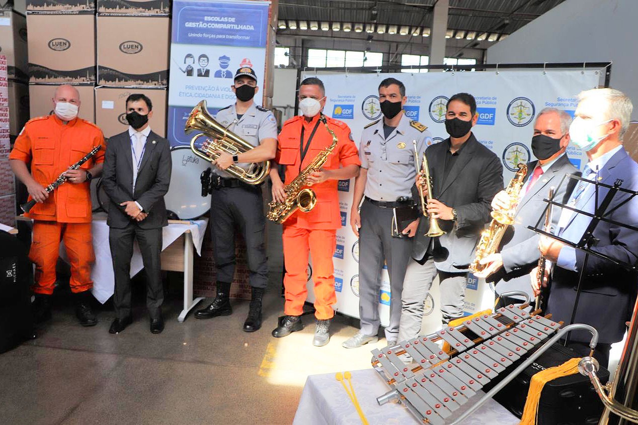 O material foi conferido pelo secretário de Segurança Pública, delegado Júlio Danilo; pelo comandante-geral da Polícia Militar do DF (PMDF), coronel Márcio Vasconcelos; e pelo secretário de Gestão Integrada da Secretaria de Segurança Pública (SSP/DF), o delegado Alciomar Goersch. Também acompanharam a entrega os subsecretários de Gestão Compartilhada, coronel Alexander Ferro; de Administração Geral, delegado Celso Wagner; e o maestro auxiliar da banda do Corpo de Bombeiros, tenente Adilson Barbosa.