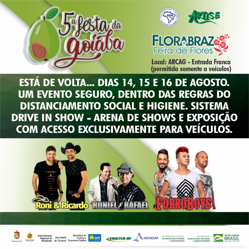 A 5ª Festa da Goiaba dará continuidade a sua programação nos dias 14, 15 e 16 de agosto, em Brazlândia. O evento, suspenso em março para evitar a propagação da Covid-19, agora volta com o formato drive thru para visitações, e drive in para shows. As apresentações terão ingressos limitados disponíveis no site Sympla. A entrada é gratuita.