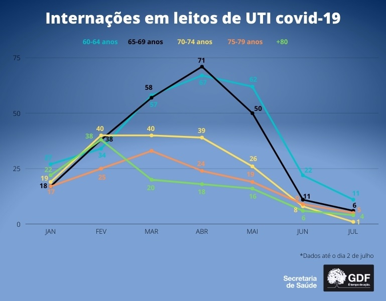 As internações de idosos em unidades de terapia intensiva (UTIs)da rede pública de saúde caíram. Segundo a Secretaria de Saúde (SES), todas as faixas etárias acima de 60 anos apresentaram queda a partir de maio. Os dados foram computados até o dia 2 deste mês.
