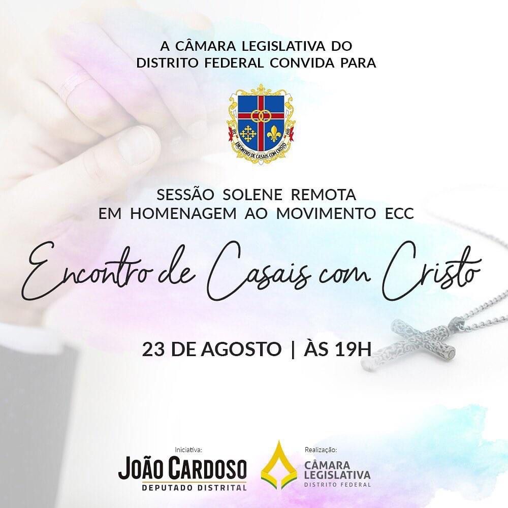 Na próxima segunda, 23, às 19h, a Câmara Legislativa do Distrito Federal realizará de forma remota, Sessão Solene em homenagem ao movimento Encontro de Casais com Cristo – ECC. Iniciado em 1970 pelo padre Alfonso Pastore na Vila Pompéia, em São Paulo- SP, na Paróquia Nossa Senhora do Rosário, o movimento hoje é um dos mais importantes serviços da igreja Católica na evangelização de famílias.
