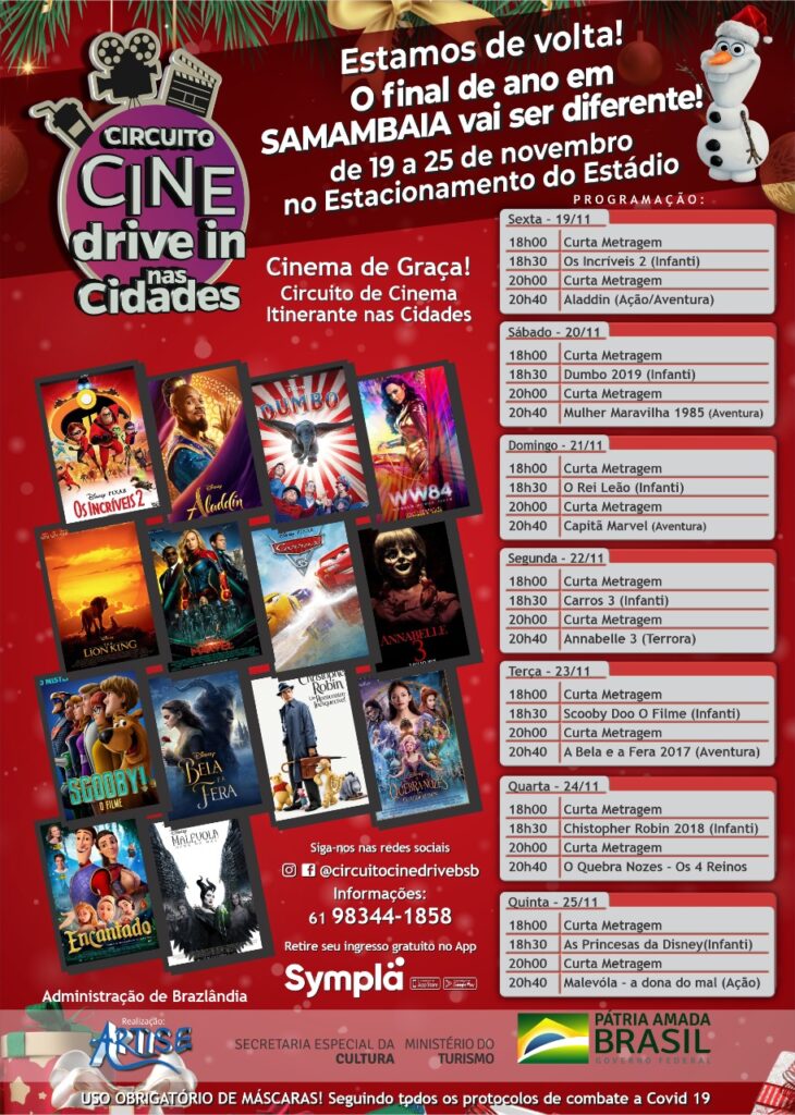A programação traz filmes para toda a família, como Os Incríveis 2 (infantil), Mulher Maravilha 1985 (aventura) e Annabelle 3 (terror). Ao todo, Samambaia terá 28 sessões de cinema com curtas e longas-metragens. O Circuito Cine Drive In nas Cidades está em sua segunda edição e em junho deste ano já passou por Brazlândia, Planaltina, Recanto das Emas e Gama.