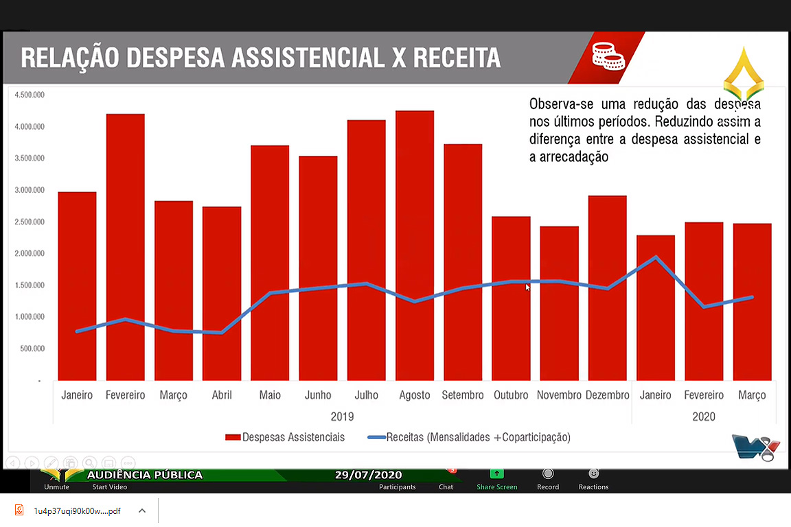 A partir da análise das receitas e despesas do plano de saúde, de 2019 a 2020, o atuário Dalmy Moreira Soares, da Wedan Consultoria, registrou ter havido redução nas despesas nos últimos períodos, acompanhada por incrementos nas receitas (mensalidades e coparticipações). “Isso tem reduzido a diferença entre os gastos assistenciais e a arrecadação”, frisou.