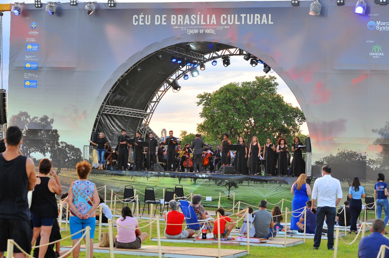 A programação do Brasília Iluminada, projeto que traz a magia e as luzes tradicionais das festas de fim de ano, segue até 17 de janeiro de 2021 (veja a programação completa abaixo). Na Praça do Cruzeiro, próxima ao Palácio do Buriti (sede do GDF), tablados de madeira para demarcar o distanciamento social foram montados em frente ao Palco Céu de Brasília Cultural (foto abaixo), espécie de ponto de referência do projeto de onde brasilienses e turistas puderam apreciar o show de luzes de inauguração, na sexta-feira (18).