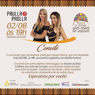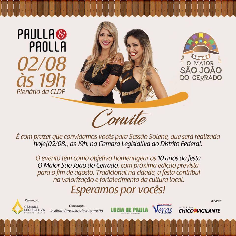 Sediadas em Brasília, a dupla Paulla & Paolla será homenageada nesta terça (02/08), às 19h, em sessão solene na Câmara Legislativa do Distrito Federal. De iniciativa dos deputados distritais Luzia de Paula (PSB), Professor Reginaldo Veras (PDT) e Chico Vigilante (PT), o evento tem o objetivo principal parabenizar os dez anos da tradicional festa Maior São João do Cerrado, com próxima edição prevista para o final de agosto.