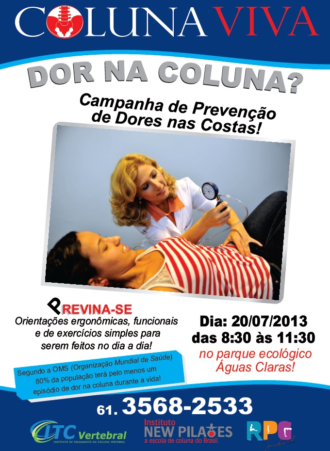 O Instituto de Tratamento da Coluna Vertebral (ITC Vertebral), por meio de suas sedes no Distrito Federal, realiza, no próximo dia 20 de julho, das 8h às 11h30, uma espécie de “blitz da saúde” no Parque de Águas Claras. O objetivo é alertar a população local sobre a importância da prevenção de dores nas costas. O evento faz parte da Campanha Nacional de Prevenção de Dores nas Costas, lançada pela Associação Brasileira de Reabilitação de Coluna (ABRC), em parceria com o ITC, em fevereiro deste ano, quando também foi lançada a cartilha preventiva que conta com dicas de exercícios que podem ser realizados no dia a dia. De acordo com a Organização Mundial de Saúde (OMS), 80% da população mundial terá, pelo menos, um episódio de dor na coluna durante a vida.