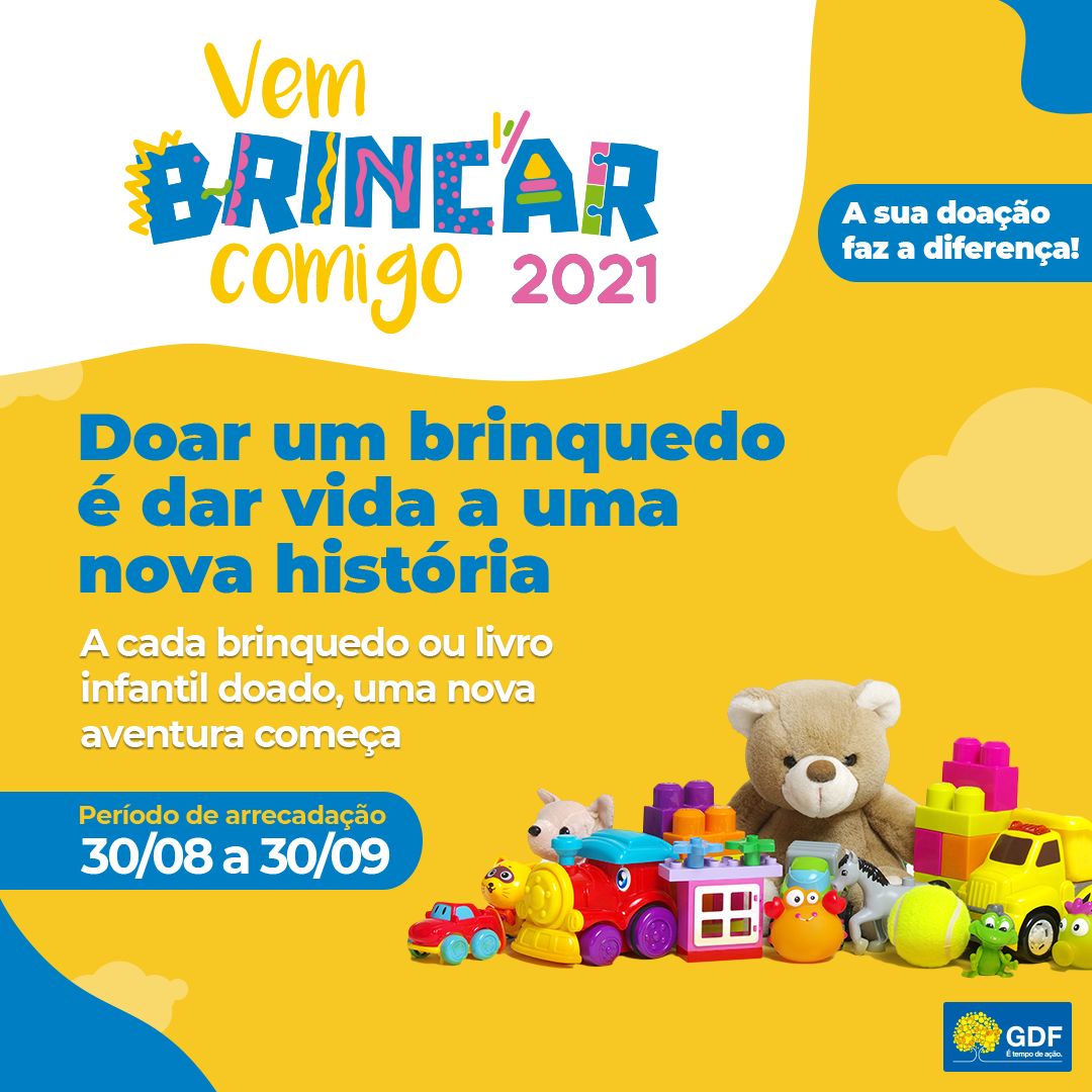 O GDF deu início nessa segunda à 3ª edição da campanha Vem Brincar Comigo. O objetivo é arrecadar brinquedos e livros para crianças em situação de vulnerabilidade social no Dia das Crianças.