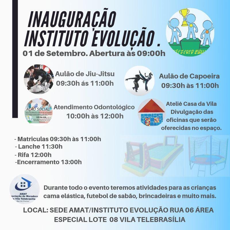 Para oferecer atividades gratuitas à comunidade, o Instituto Evolução (entidade sem fins lucrativos) irá inaugurar neste domingo (1º/9), às 9h, sua sede na Vila Telebrasília. O espaço cedido pela Associação dos Moradores da Vila Telebrasília estava abandonado há algum tempo e, agora, servirá como ponto comunitário