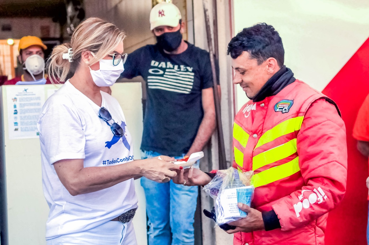 Os kits foram arrecadados por meio de doações que o programa – comandado pelo vice-governador Paco Britto – vem recebendo de empresários da cidade. “As máscaras são muito importantes para quem tem que sair às ruas. O álcool em gel é outro aliado importante para a higiene na luta contra o coronavírus”, frisou Paco, acompanhado de sua esposa, Ana Paula Hoff. Os motoboys foram chegando, um a um, recebendo orientações e o lanche da pizzaria. “Com a máscara, você me protege e eu te protejo. Não pode deixar de usar”, disse Ana Paula a um dos entregadores.