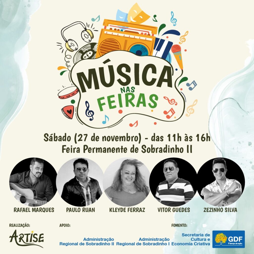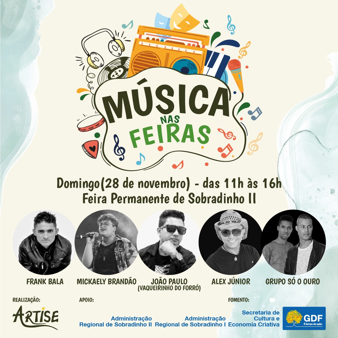 No período de 27 de novembro a 6 de março, o projeto Música nas Feiras irá percorrer as cidades de Sobradinho e Sobradinho II com apresentações musicais aos finais de semana, sempre das 10h30 às 15h30. O objetivo é dar visibilidade aos artistas locais, promover entretenimento de qualidade e democratizar o acesso à cultura por meio da ocupação de espaços públicos.