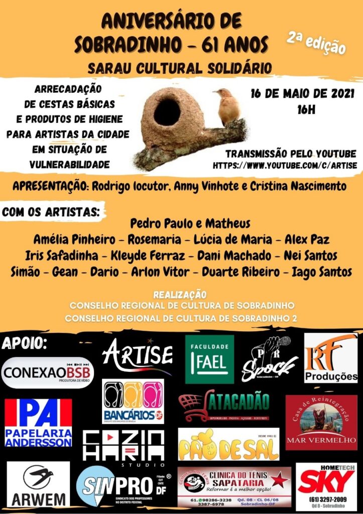 O Sarau Cultural Solidário será transmitido pelo Youtube da Artise e tem como atrações artistas locais, como: Pedro Paulo e Matheus, Amélia Pinheiro, Rosemaria, Lúcia de Maria, Alex Paz, Iris Safadinha, Kleyde Ferraz, Dani Machado, Nei Santos, Simão, Gean, Dario, Arlon Vitor, Duarte Ribeiro e Iago Santos.