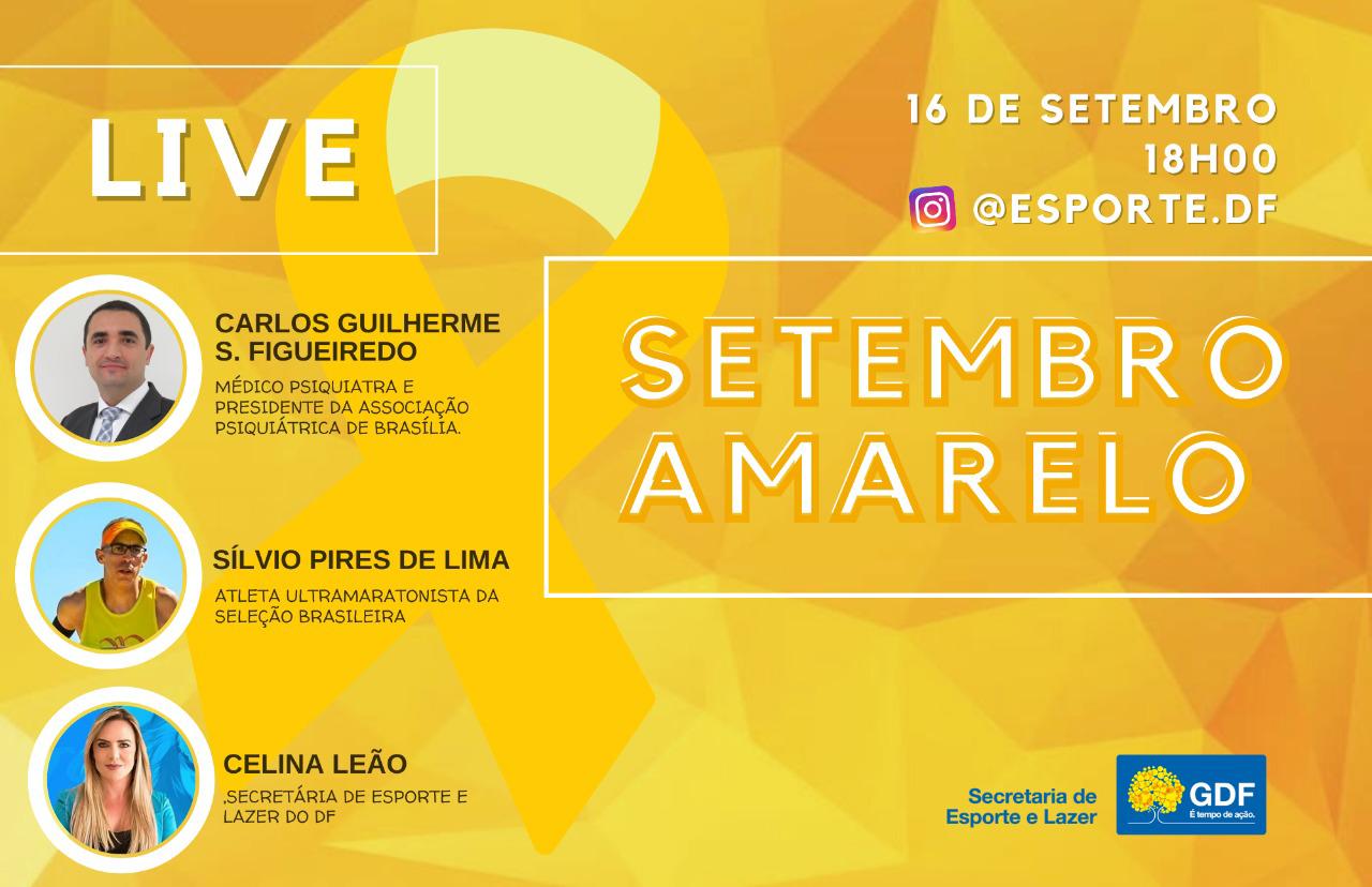 Dentro da dinâmica de valorização da vida, mote da campanha Setembro Amarelo – criada com fundamento no Dia Mundial de Prevenção ao Suicídio, 10 de setembro –, a Secretaria de Esporte e Lazer (SEL) fará uma transmissão ao vivo, a partir das 18h desta quarta-feira (16), por meio do Instagram da pasta (@esporte.df).